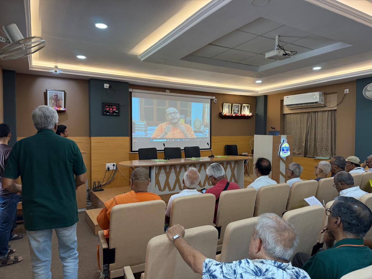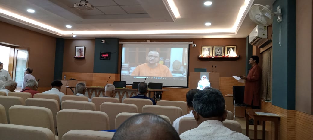 2. A video message from revered secretary, Ramakrishna Mission Ashrama, Narendrapur, Swami Shastrajnananda ji maharaj was played on screen. He identified himself as an alumnus of RKM as well and narrated his experiences with various alumni associations that he has been associated with. He reminded everyone that NRVP is linked to an educational institute. It is not an independent NGO. He narrated the history of the introduction of the first RKM-related alumni association at Belur Vidyamandir in 1956. The then President of Ramakrishna Math and Mission, most revered Swami Bireswarananda ji, blessed the initiative and asked the founding members to stick to the ideal of service (seva) in line with the ideals of RKM. He encouraged everyone to go beyond small differences that may crop up within the association and ensure that such differences do not escalate into acrimony. Secretary maharaj proposed that if there is an impasse, the advice of the headmaster of the Vidyalaya and/or the secretary of the ashrama may be taken. Selection instead of election is one way to avoid such escalations, he noted. He ended his speech by reminding everyone of the august heritage of the Vidyalaya preserved and enriched by great monks and teachers.